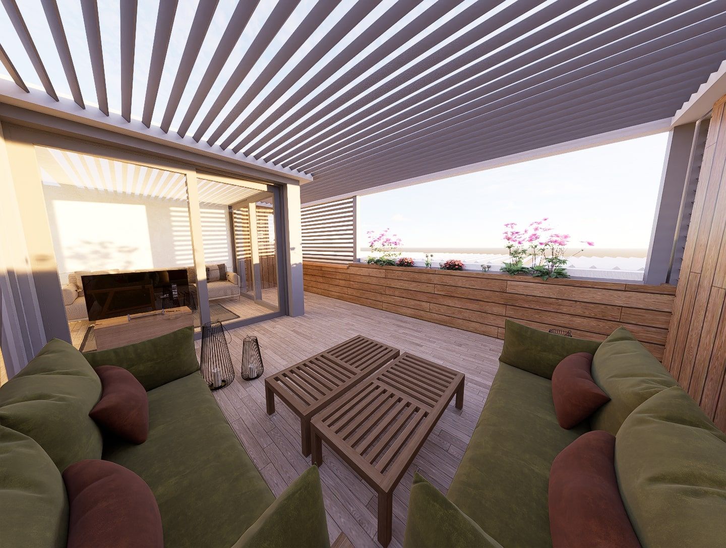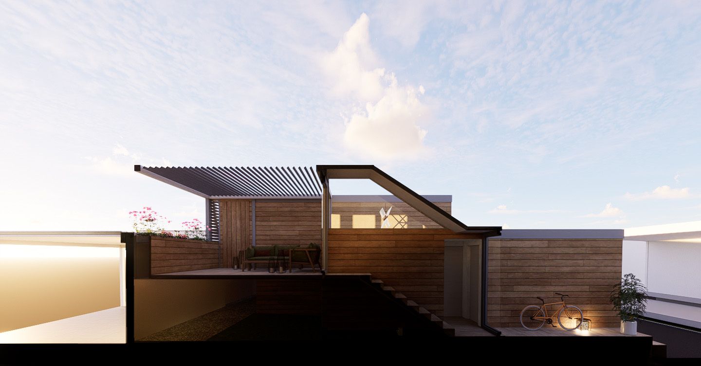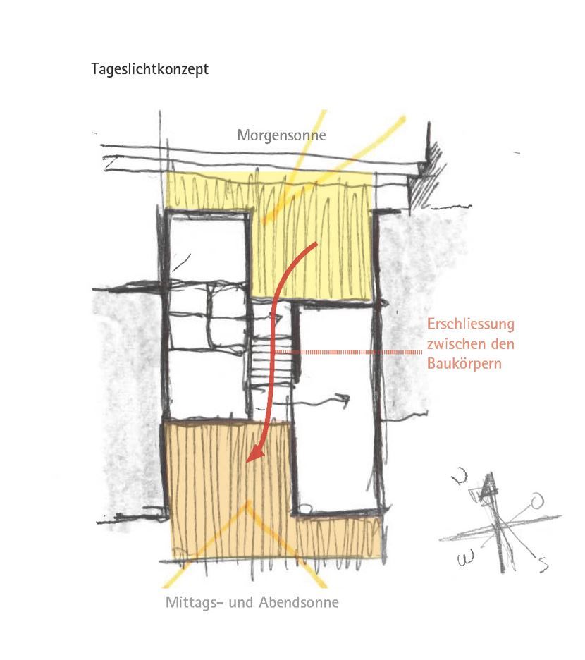 Die Idee ist es, Aussenräume nach dem Tageslicht zu orientieren. Die Strassenseite eignet sich optimal für den Aufenthalt am Morgen und der Begegnung mit anderen Besuchern im Strassenraum. Vom Mittag bis hin zum Sonnenuntergang, bietet die erhöhte Südwestterrasse einen idealen Raum für privatere Anlässe.