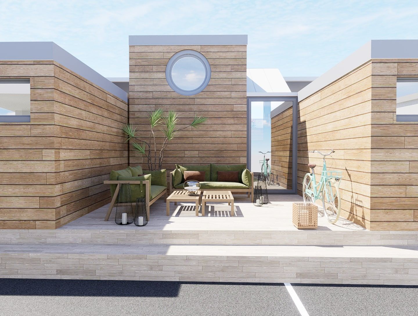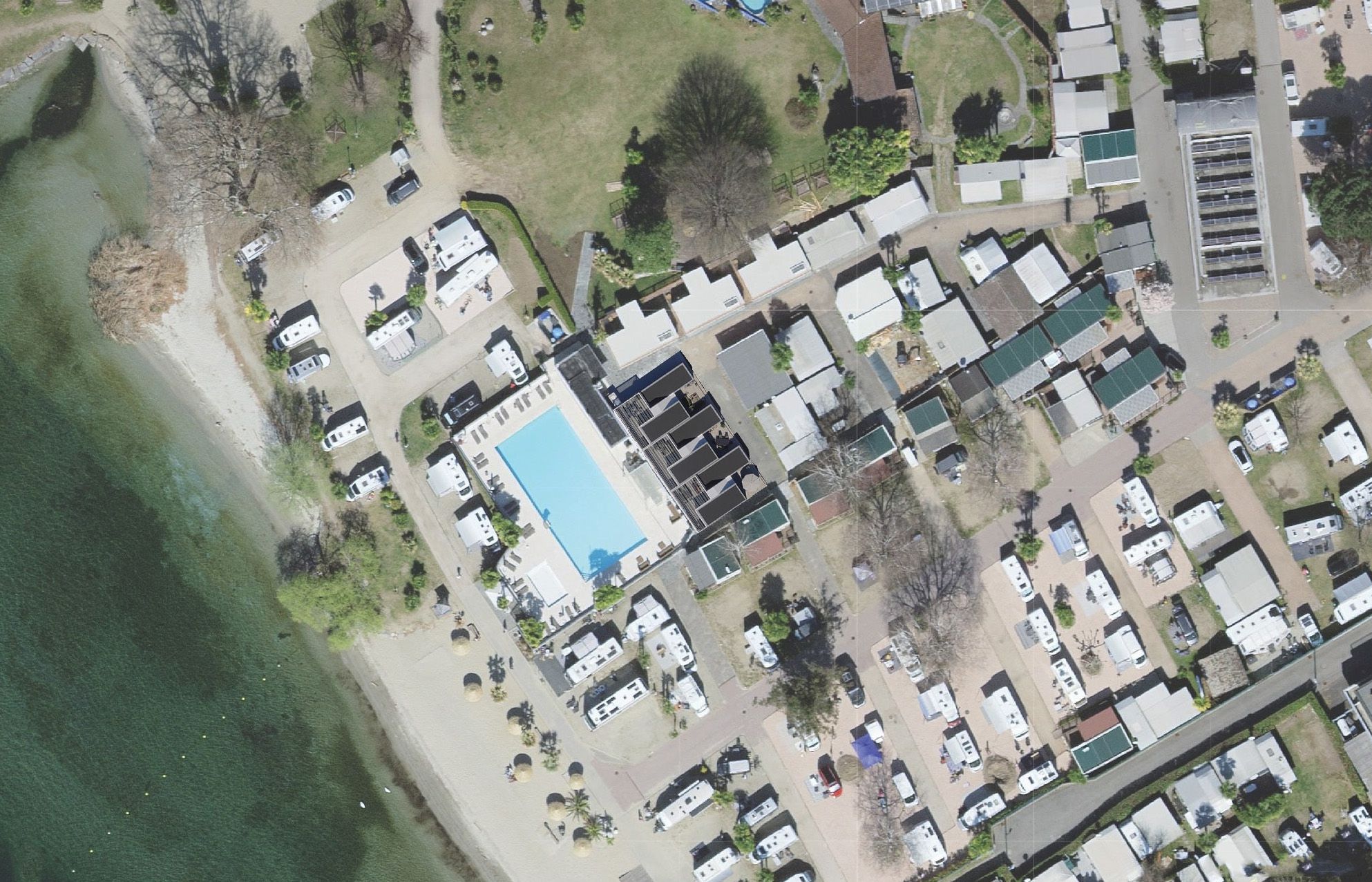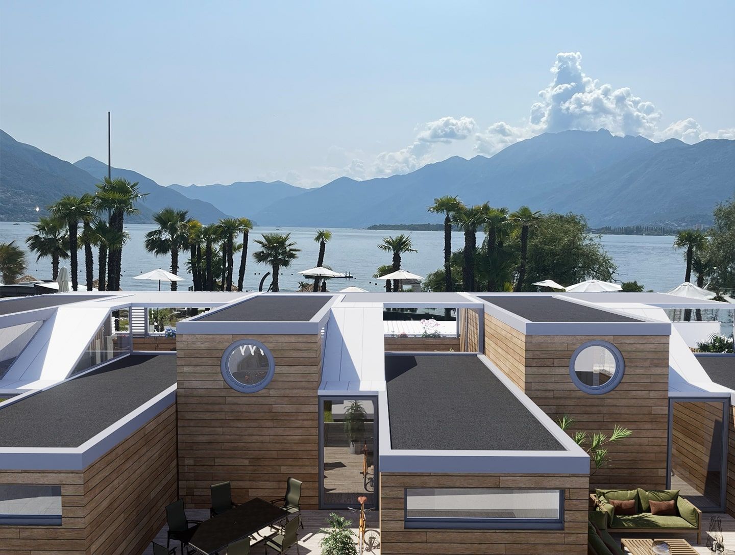 Eine Projektstudie für drei Bungalows an einem Campingplatz am Laggio Maggiore.
