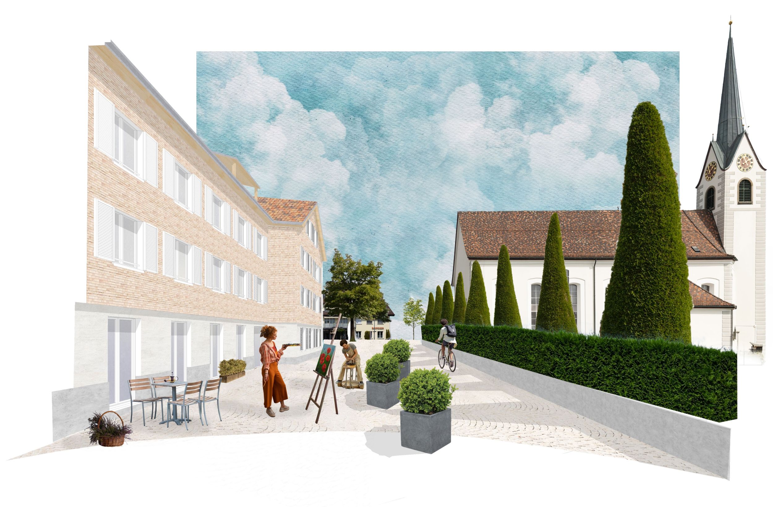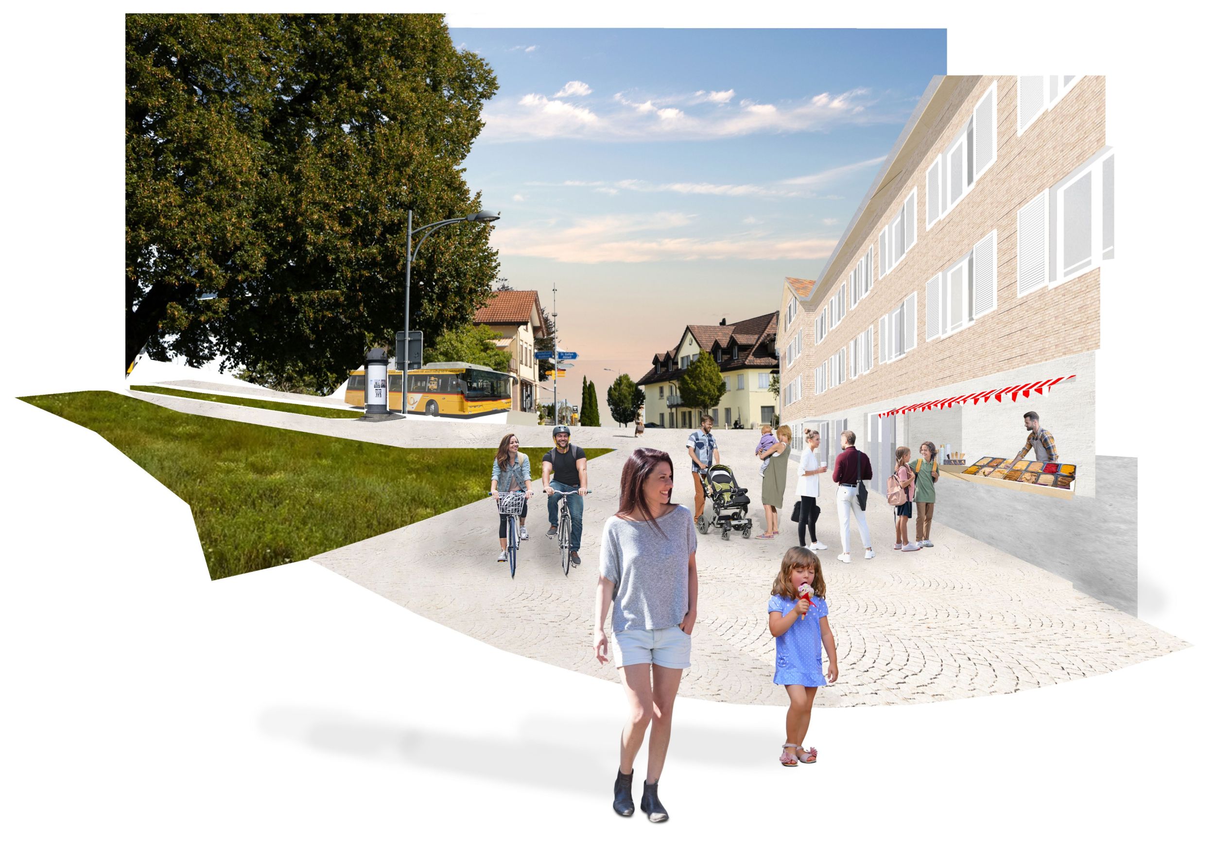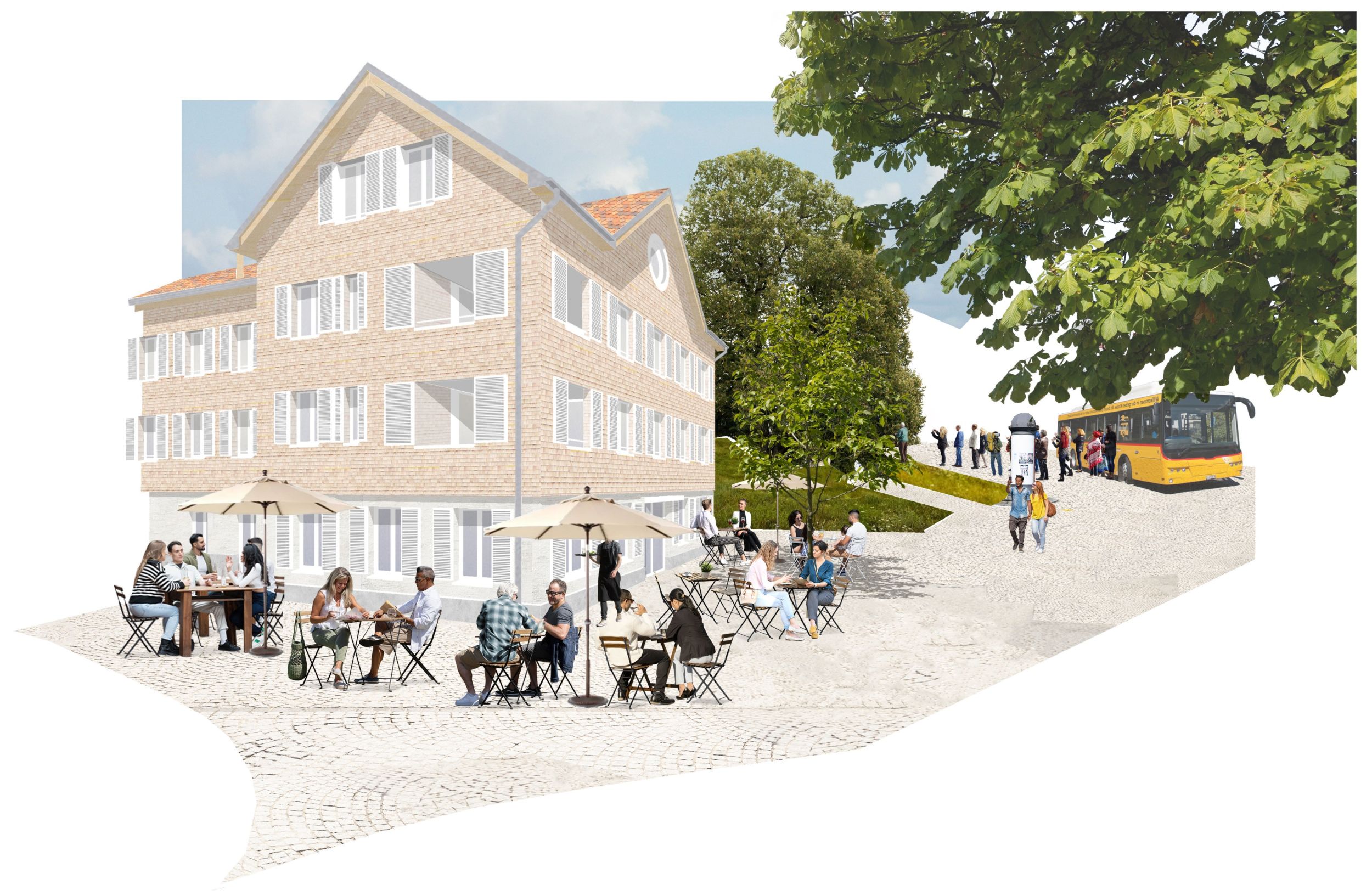 Am Dorfplatz in Engelburg planen wir ein neues Wohn- und Gewerbehaus. In den oberen Geschossen werden wir Wohnraum zur Miete an bestens erschlossener Lage anbieten. Das Erdgeschoss soll Gewerberaum sein. Unser Ziel ist es, den Dorfplatz durch ein öffentliches Erdgeschoss wiederzubeleben. Was eignet sich besser, als ein Restaurant, um einen Ort mit Leben zu füllen?
