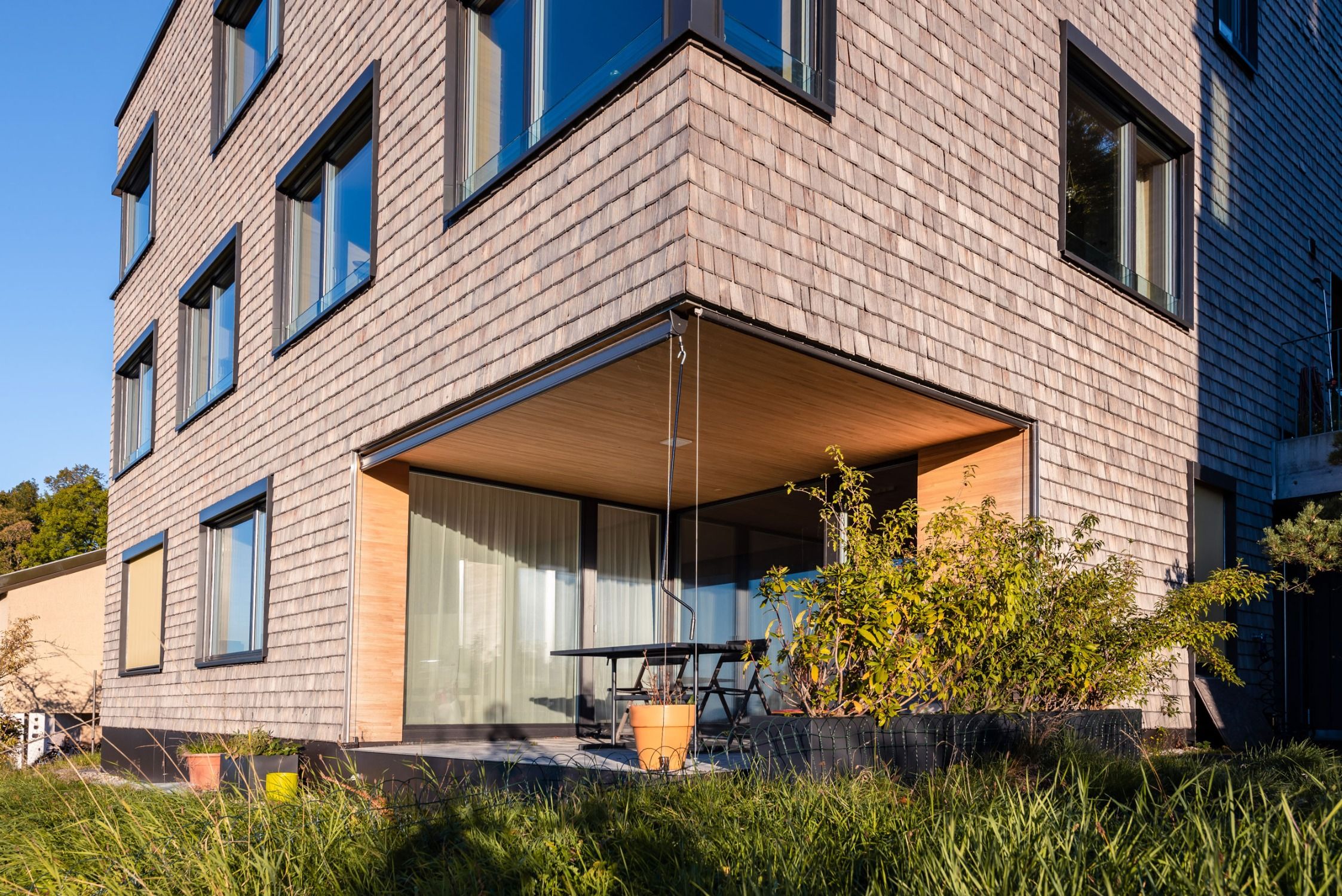 Ein Generationenhaus und ein Mehrfamilienhaus mit Maisonette-Eigentumswohnungen bilden ein kleines Ensemble. Die Gebäude im Minergie-P-Standard wurden als viergeschossige Massivholzbauten errichtet. Wände und Decken wurden mit sichtbaren Oberflächen des Schuler Blockholzsystems ausgebildet.